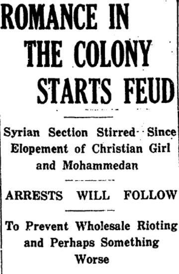 In the venerable tradition of American-immigrant Shakespeare adaptations, allow me to propose another setting for the story of Romeo and Juliet: downtown Springfield, Massachusetts, early twentieth century, a community of Arabic-speaking immigrants. There, in 1916, Allie Soffan and Elizabeth Moffett ran away to marry against the will of Elizabeth’s family. Both “Syrians” in local parlance, Soffan was Muslim and Moffett was Christian. Their elopement, according to the Springfield Daily News, sparked a scuffle between local Muslim and Christian Syrians, leading to arrests of several Christians and a special police detail for the Syrian neighbourhood.[1]